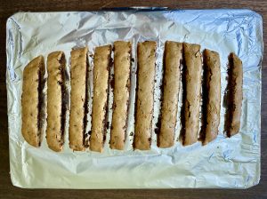 - Remove from oven and slice into sticks while you set aside to cool.