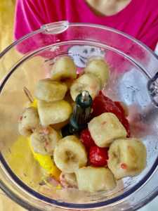 The first time we made it, I had a blast because I like to use the blender. A cool fact about the recipe is that you can even eat it for breakfast because it is made of only fruit. We like to add blueberries, raspberries, strawberries and of course, bananas. You don’t have to add extra fruit if you don’t want to.