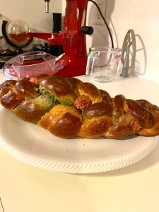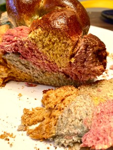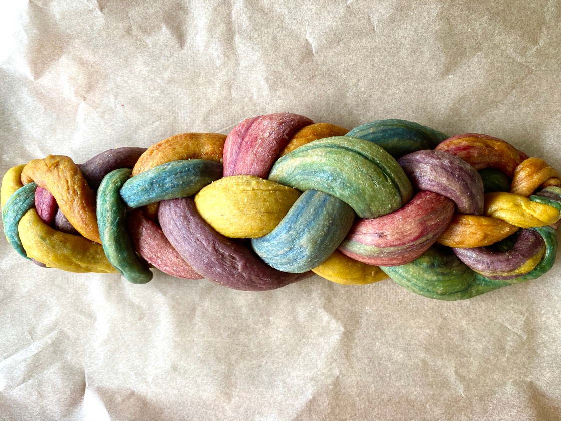 Today I was thinking of making challah. And I did. Rainbow challah, which we also call unicorn holla challah. (For the real fun, say it like, “hOoOooOllaaaaah.”) I made it with my family. I love that it took so long. Long recipes mean I get to spend more time with my family. We choose to do a rainbow challah because we made plain challah before and I wanted to try something new. It was very fun to add the food coloring to the dough balls. My hands got messy and looked tie-dyed. It washed off.